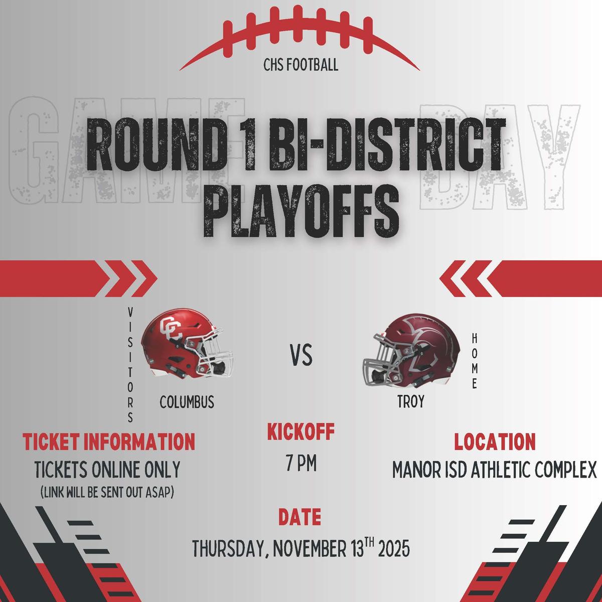 Cardinal Fans! It’s time to show up and show out. Columbus battles Troy on Thursday, November 13, 2025, at the Manor ISD Athletic Complex. Kickoff is at 7:00 pm, and we’re calling for a loud, proud sea of red in the stands.
